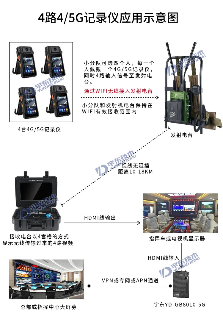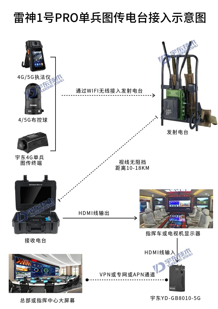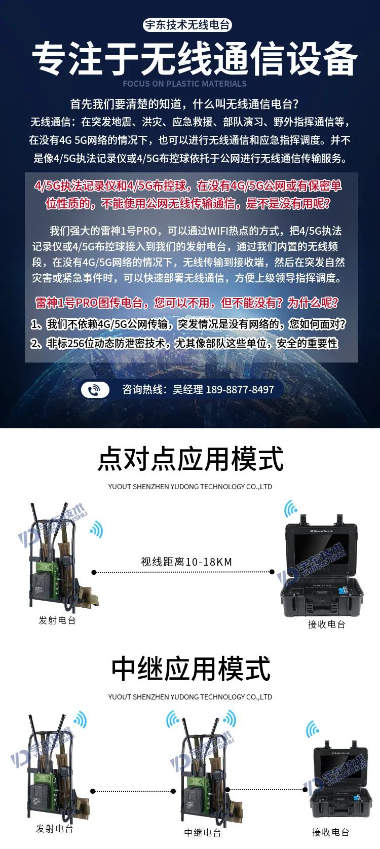 宇东技术雷神1号PRO背负式高清单兵无线图传电台,是公司针对应急救援指挥、部队拉练演习、公安、反恐作战、消防救援、边防执勤、海警海关巡检、森林消防等,在突发重大事件,断网断电,通信中断的情况下,现场工作人员通过宇东雷神1号PRO单兵无线图传电台,可以和指挥部双向语音通话对讲,把现场采集的数据实时无线传输到指挥车/临时指挥部大屏幕,让指挥部领导对现场情况一目了然,节省了到达现场的时间,可快速做紧急指挥调度,最大限度的减少突发事件带来的各种损失。