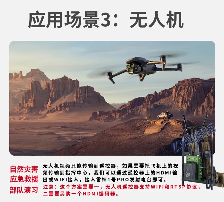 雷神1号PRO背负式高清单兵无线图传电台采用工业级无线高速率数据传输技术,集合正交频分复用时分多址调制及 MIMO 多进多出容量技术,完全基于 IP 互联网协议,实现全双向透明通道宽带传输。非视距:500-1500 米;高对低地面视距或空对地视距:10-18 公里。接收电台为指挥箱款,内置电池和显示屏,四宫格显示视频画面,并支持HDMI、RJ45网口、内置超级WIFI输出视频,支持RTSP协议,可以有线和无线拉流视频源,创新性液晶一体化、扩展的 WIFI 热点设计,便捷了用户的使用方式,更好的用户角度体验。
